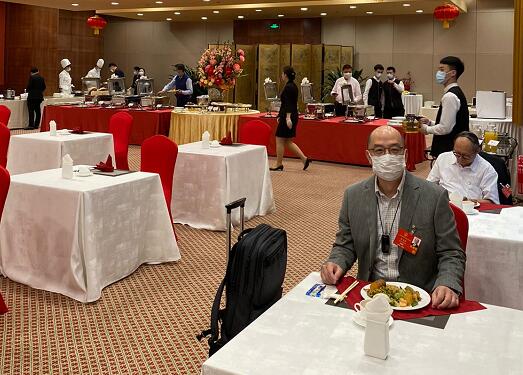據官方早前公布視頻顯示,北京飯店駐地入口設置體溫檢測、安全檢查等設備,用餐區域布置、通風消毒、食材供應等後勤服務也籌備就緒。為確保用餐時的安全,餐廳裏每個餐桌只允許一人就餐,餐廳外放置了一次性手套、測溫槍、口罩自封袋等。會議室的話筒、車輛亦已進行消毒。