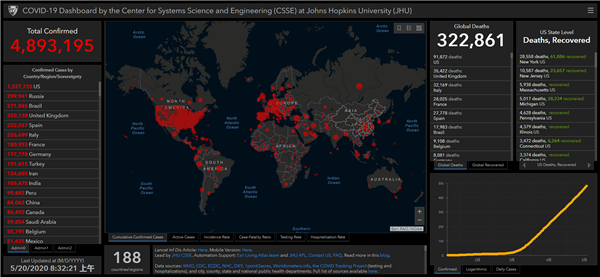 据美国约翰斯·霍普金斯大学发布的疫情数据显示,截至香港时间20日8:32,全球累计确诊逾489万例,累计死亡32万例。美国累计确诊逾152万例,累计死亡逾9万例。随着美国多州放开限制措施,在5月10日至16日的一周期间,亚利桑那州、北卡罗来纳州、北达科他州、得克萨斯州和弗吉尼亚州的新冠肺炎病例数均出现了最高增幅。