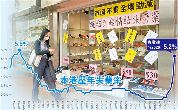 本港失业率连升7个月至5.2%,创逾10年新高;与消费及旅游相关行业合计失业率更急升至9.0%,为超过15年来高位。