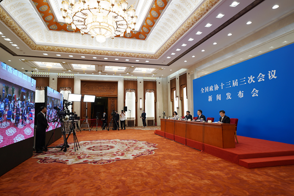 5月20日,全国政协十三届三次会议召开新闻发布会。大会新闻发言人郭卫民向中外媒体介绍本次大会有关情况并回答记者提问。图为新闻发布会现场。新华网