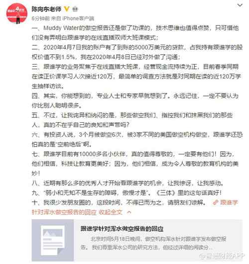 陳向東批渾水不瞭解「跟誰學」的業務模式,沒弄清「跟誰學」的在線直播雙師大班課模式。至於股權問題,陳向東解釋稱,今年4月7日,他的帳戶有了到賬的5000萬美元貸款,佔其持有「跟誰學」的股權價值不到1.5%,這一點他在4月8日已對外進行說明。