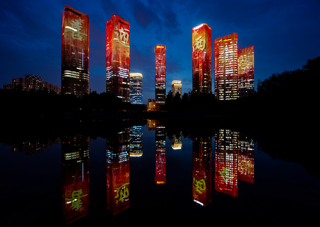 5月20日晚间,北京市朝阳区望京地区的高层建筑亮灯,显示出「喜迎两会」字样,迎接2020年全国两会。中新社
