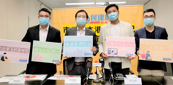 民建聯立法會議員柯創盛分析,疫情肆虐多個月後,經濟打擊正廣泛而且深入影響市民收入。該黨提6項建議,包括要求政府提供全面支援予市民,盡快落實不設資產審查的失業經濟援助金,向能夠提供失業證明的申請人每月發放為期不少於三個月的6000元現金資助;主動創造更多就業機會,如於政府開設中短期合約職位等。他表示政府應盡快籌劃疫後經濟重建措施,不可只停留在抗疫期間的短期援助,強調要有長遠的經濟重建措施,才能令香港重回正軌。