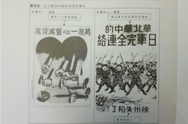 据大公文匯全媒體報道,中學文憑試今日(21日)考中史科,卷一其中一條必答題,展示兩款抗日戰爭時的宣傳品,其中一個傳單上有一班表情興奮的日軍手持武器歡呼慶祝勝利,寫有「徐州失陷」以及「華北華中的日軍完全連絡」,另一張海報展示很多拳頭揮向在地上的日本軍人,寫有「萬眾一心誓滅倭寇」。考題考問學生兩個宣傳品描繪日軍的形象有何分別,甚至「暗度陳倉式」公然問及考生是否同意日軍歡呼宣傳品的觀點。
