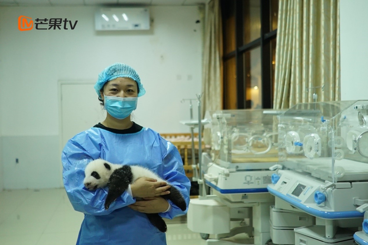 成都大熊貓繁育研究基地飼養員段東瓊與幼年熊貓