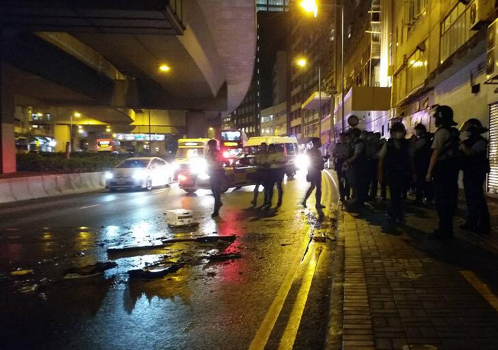 【香港商報网訊】記者區天海報道:昨晚11時許,觀塘道320至322號中心對開往旺角方向行車線,突然有雜物起火焚燒,火光熊熊,阻礙車輛行駛,期間傳出爆炸聲,駕駛人士見狀報警,大批防暴警察接報到場戒備,消防員開喉迅即將火救熄。