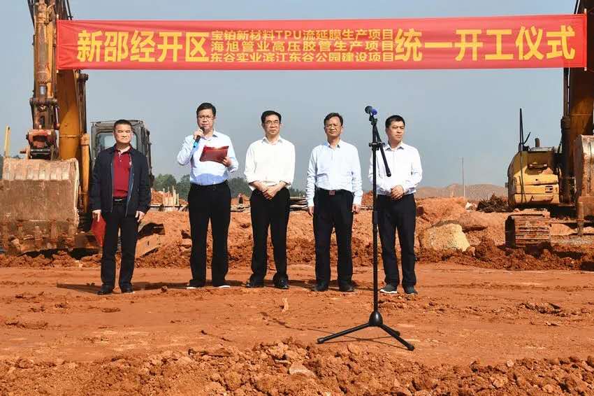 新邵經開區這次集中開工的3個專案涵蓋新材料、休閒旅遊等方面,計畫總投資5.15億元。其中,海旭管業高壓膠管生產專案、寶鉑新材料TPU流延膜生產專案兩個產業專案投產達產後可實現年產值4億元,年創稅收1800萬元左右,解決就業崗位450餘人。濱江東穀公園占地260畝,將建設天池仙境陸上樂園、登山徑市民公園、奇幻水樂園等內容。