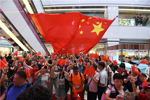 早前市民在商場唱國歌,揮國旗支持《國歌法》立法。 資料圖片