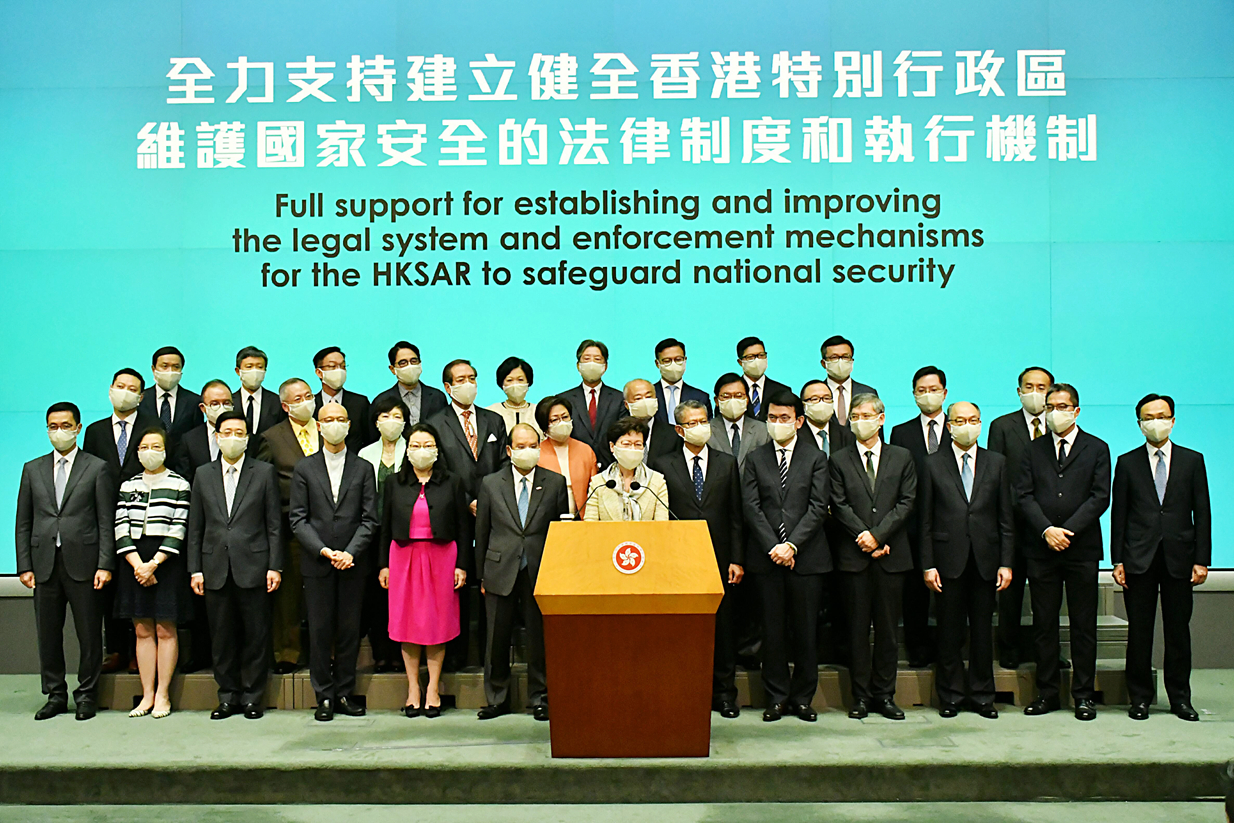 特首林鄭月娥昨晚與大部分政府主要官員及行會成員,就全力支持建立健全香港特別行政區維護國家安全的法律制度和執行機制,在政總召開記者會。記者馮瀚文攝
