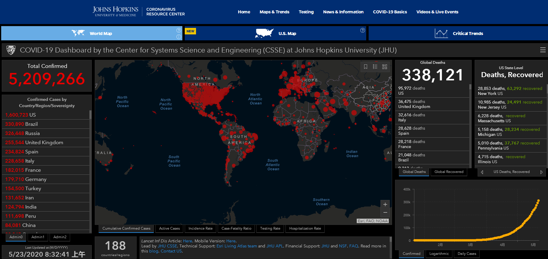 美国约翰斯·霍普金斯大学发布的实时统计数据显示,截至香港时间5月23日8时30分左右,全球累计确诊新冠肺炎病例5209266例,累计死亡338121例。美国已有新冠病毒感染病例1600723例,其中包括死亡病例95972例。与24小时前的数据相比,美国新增感染病例24889例,新增死亡病例1281例。