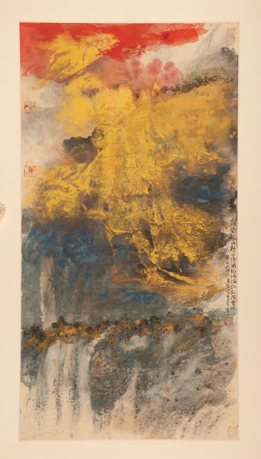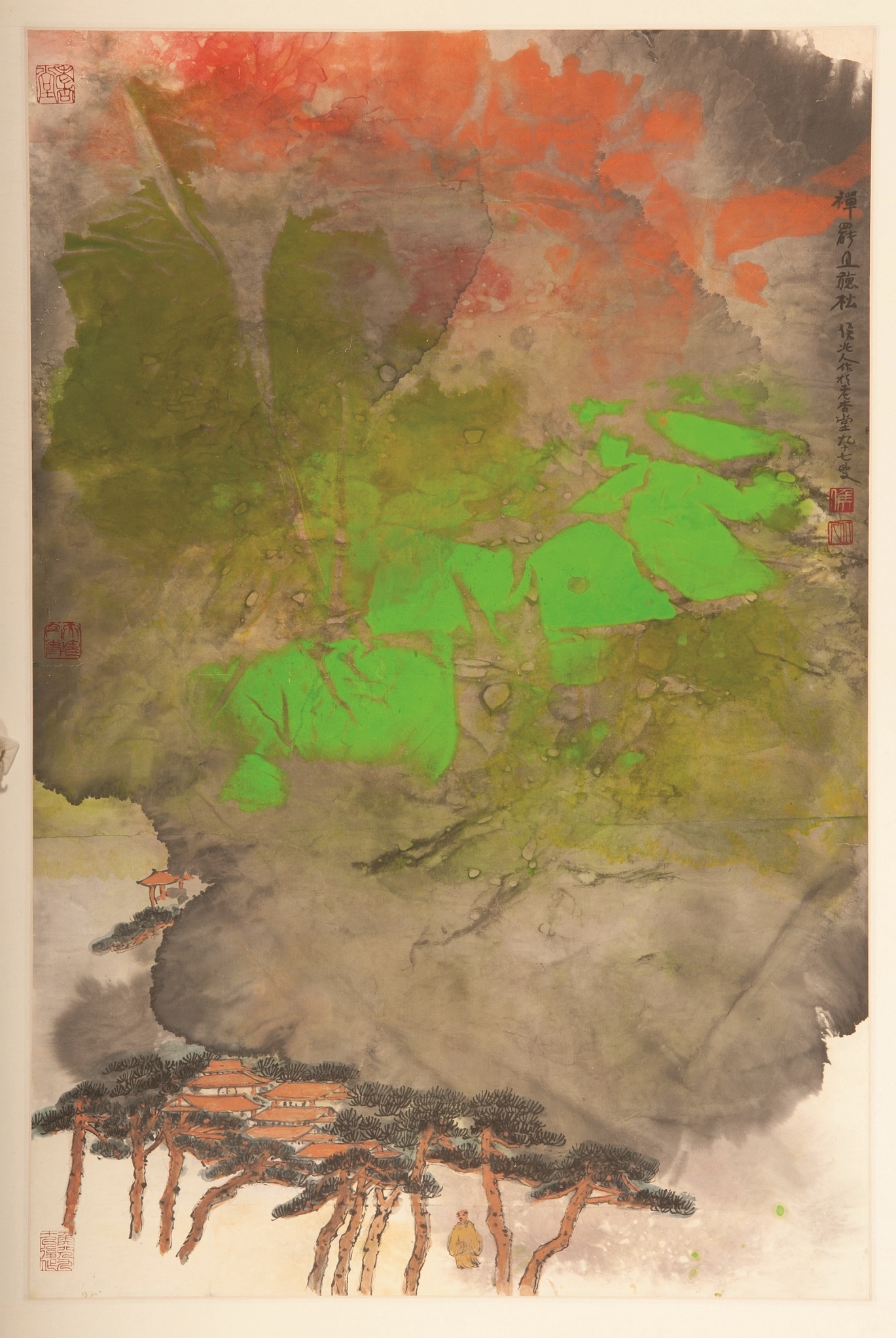 儘管侯氏與張大千均寫潑墨山水,筆者認為侯北人在顏色的使用更為「出位」。他早期的潑墨山水畫緊隨張大千對飽和色彩的使用,包括藍色、綠色等。到上世紀90年代,他潑墨和潑彩越來越具有實驗性,更多鮮艷、飽和的顏色呈現其畫中,如紅、橙、黃、青綠、藍、白等。在侯北人近年的畫作中,能看到各種水墨色彩以潑、點抹等方式看似毫無拘束般舒張畫面之上,包括展品《霜染秋山》及《秋山紅遍》,雖然兩件作品同樣描繪秋山景色,侯氏使用不同顏色、筆法讓其展現出不同的秋景,交織出如同油畫般色彩,予人視覺的衝擊。