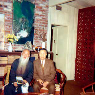 1971年,侯北人(右)拜訪張大千(左)時於張大千在美國加州的寓所拍照。(侯北人及崑山市侯北人美術館提供)