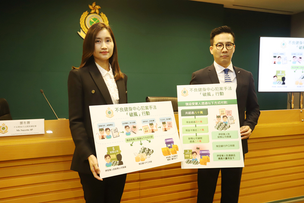 海關不良營商手法調查課第2組指揮官黃志聰表示,健身中心職員除要求受害人以現金支付費用外,亦會教受害人應對銀行職員查詢,以便從銀行提取大量現金,掏空其銀行戶口。職員又以「保密協議」為藉口,威嚇受害人稱破壞協議將會被索償,令受害人一直不敢向家人透露,導致最終因無力償還欠債,飽受壓力,最終被家人發現始揭發事件。