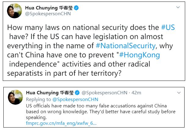 环球时报报道,全国人大将“香港国安法”纳入会议议程审议后,部分美国政客开始气急败坏,跳出来横加指责、干涉中国内政。26日中午,外交部发言人华春莹在推特发出“灵魂质问”。