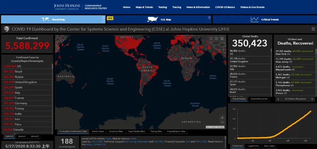 美国约翰·霍普金斯大学发布的实时统计数据显示,截至香港时间27日8时32分,全球累计确诊5,588,299例,累计死亡349,894例。其中,美国确诊病例为1,680,625例,死亡98,902例。