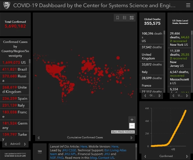 美国约翰斯·霍普金斯大学发布的实时统计数据显示,截至本港时间5月28日8时32分,全球累计确诊新冠肺炎病例569万0182例,累计死亡35万5575例。美国累计确诊169万9073例,累计死亡10万0396例。美国疾病控制和预防中心26日称,超6万美国医生和护士因照看新冠肺炎患者而感染。