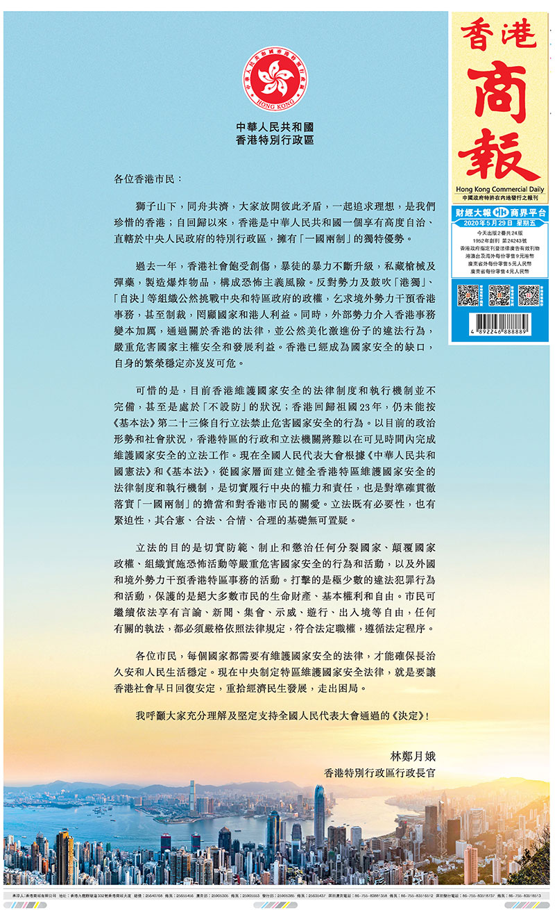 【香港商報網訊】28日,十三届全国人大三次会议高票通过《全国人民代表大会关于建立健全香港特别行政区维护国家安全的法律制度和执行机制的决定》,行政长官林郑月娥就此向全港市民发出一封公开信,全文如下: