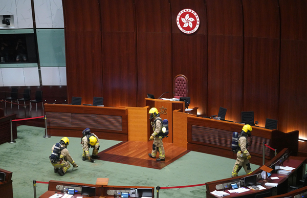 許智峯在會議廳內投擲惡臭的腐爛植物「臭彈」,消防員到場處理。中新社