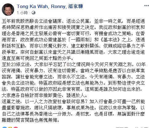 香港行政会议成员、资深大律师汤家骅发文感慨,如今的公民党与创党之初的理念逾离逾远,他认为,香港政改要成功应基于「一国两制」和《基本法》,透过对话和互动,而非以妖魔化对方。