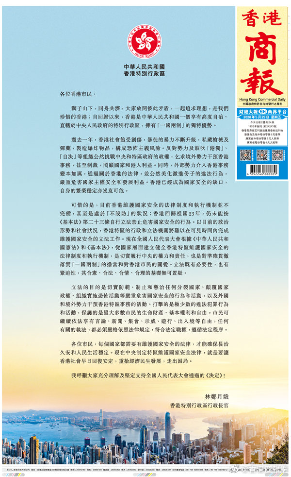 28日,十三届全国人大三次会议高票通过《全国人民代表大会关于建立健全香港特别行政区维护国家安全的法律制度和执行机制的决定》,行政长官林郑月娥就此向全港市民发公开信,呼吁市民充分理解及坚定支持全国人民代表大会通过的《决定》,并强调制定「香港国安法」的立法既有必要性,也有紧迫性,其合宪、合法、合情、合理的基础无可置疑。
