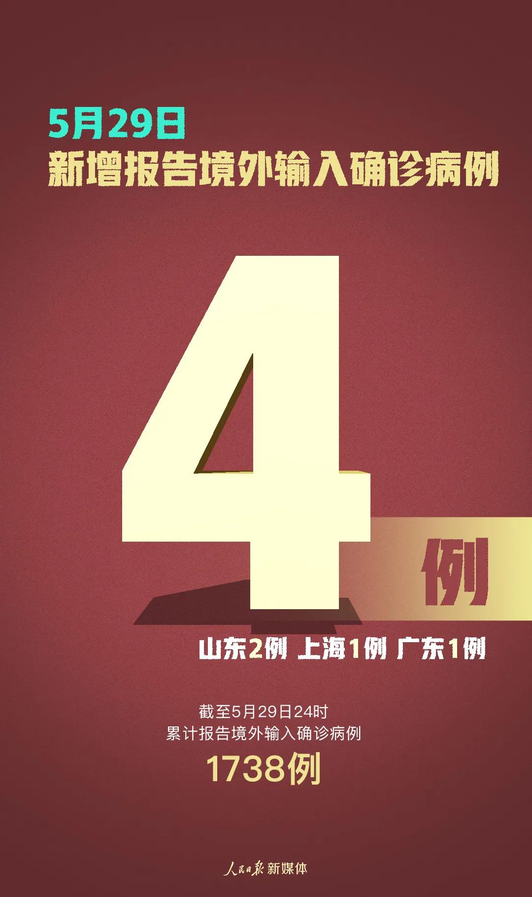【香港商报网讯】5月29日0—24时,31个省(自治区、直辖市)和新疆生产建设兵团报告新增确诊病例4例,均为境外输入病例(山东2例,上海1例,广东1例);无新增死亡病例;新增疑似病例1例,为境外输入病例(在上海)。