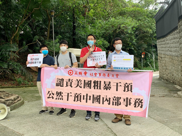 昨早11時起,工聯會、香港善美大聯盟等團體,以及多批市民先後到美國駐港澳總領事館示威抗議。工聯會社會事務委員會一行人高舉「強烈譴責美國粗暴干預」、「立即停止損害香港」及「一國兩制不容詆毀」等標語,並高叫口號,對美國干預中國內部事務及惡意詆毀「香港國安法」表示強烈譴責,要求美國立即停止干預。