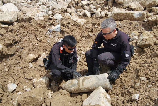 爆炸品處理課人員檢查相信是戰時遺下的炸彈。