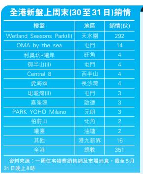 個別新盤在上周末銷售成績不俗,其中新鴻基地產(016)副董事總經理雷霆表示,天水圍Wetland Seasons Park第2期,上周六(30日)進行次輪推售,推出單位速沽逾97%。兩輪推售售出接近500個單位,為集團套現約33億元。由於市場尚有眾多向隅客,故加推第六號價單,涉及118個單位,折實平均呎價12920元,比對五號價單只輕微上升。雷霆亦指出,集團部署於6月下半旬推售位處海榮路的項目。