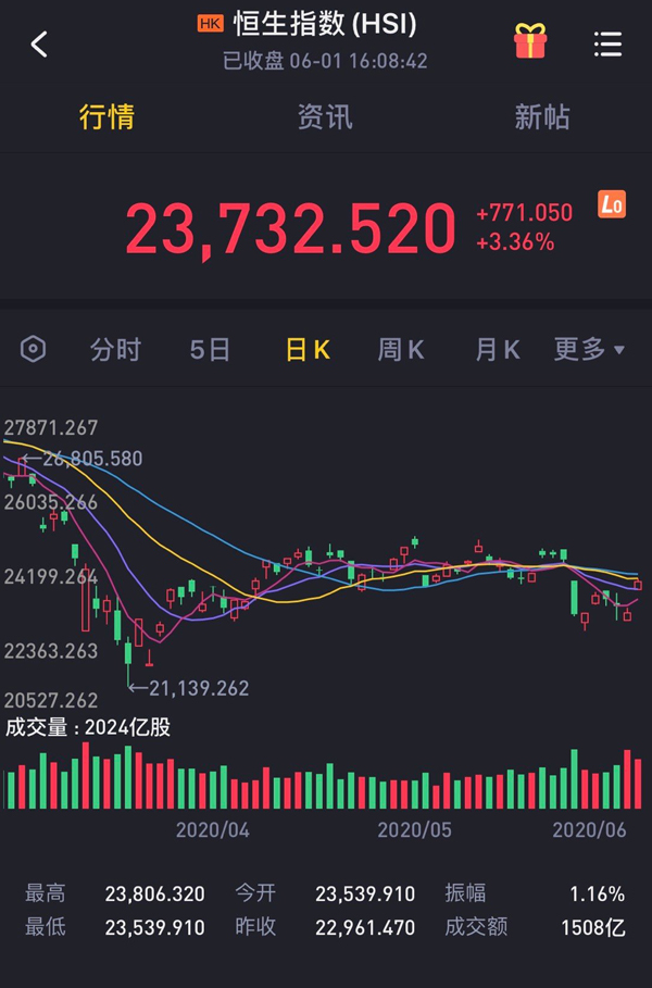【香港商报网讯】6月1日,香港恒生指数收涨3.36%,为3月25日以来最大单日涨幅。国指涨2.85%报9833点。大市成交量为1507.53亿港元,南下资金净流入29.54亿港元。