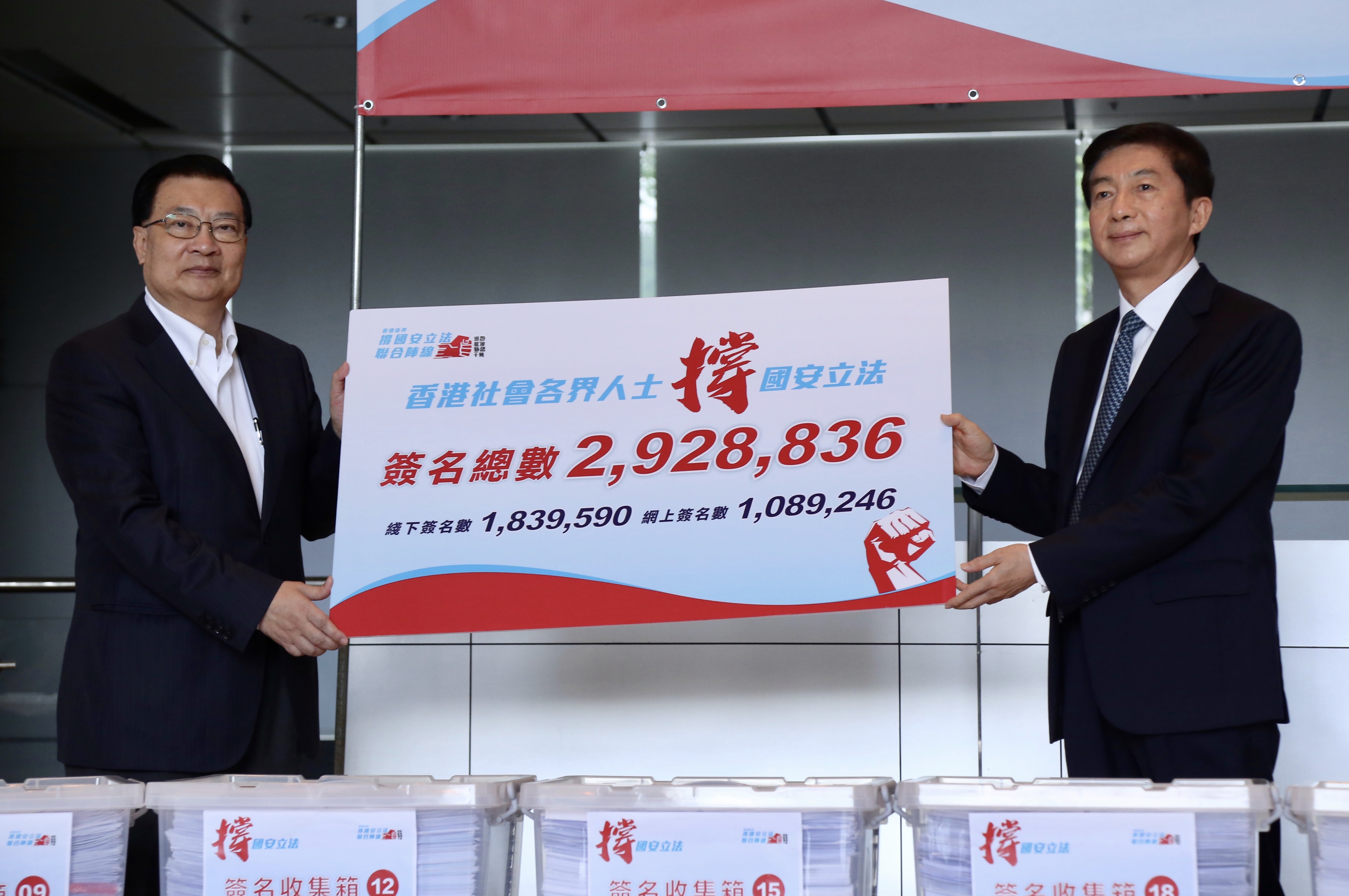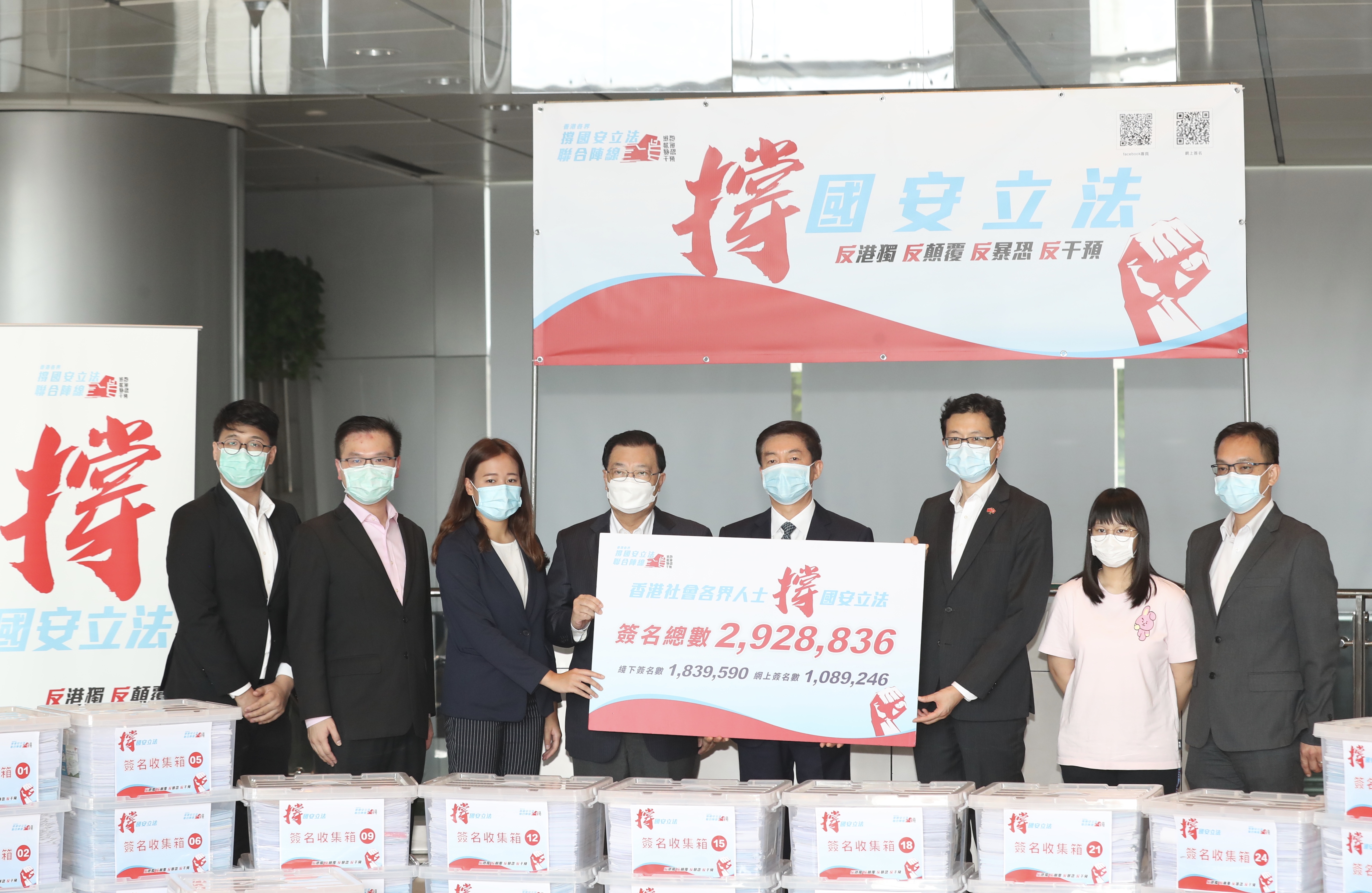 香港各界撑国安立法联合阵线由全国人大常委会委员谭耀宗等13位召集人共同发起组建。 5月24日至31日,联合阵线在全港开展为期8天的“撑国安立法”签名行动,开设5400余个街站,收集街头签名1839590个、网络签名1089246个,签名总数为2928836个。