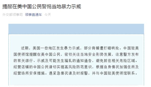 近期,美国一些地区发生暴力示威,部分商铺遭打砸哄抢。中国驻美国使领馆提醒在美中国公民,密切关注当地安全形势发展,注意警方发布的有关游行、示威及可能发生骚乱的通知通告,避免前往相关危险区域。经营店铺的中国公民请切实提高风险防范意识,根据自身情况加强住所及经营场所安保措施。遇紧急情况请及时报警,并与中国驻美使领馆联系。