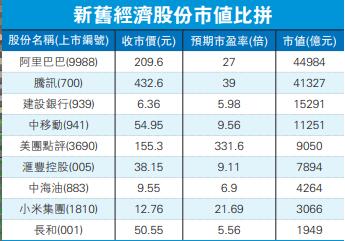 綜觀在港上市5大市值最高股份,排名第1、2、5位的均是新經濟股。阿里巴巴(9988)以市值44984億元排頭位、緊隨其後是市值達41327億元的騰訊(700)。第3和第4位分別是內銀股建行(939)以及電訊股中移動(941)。