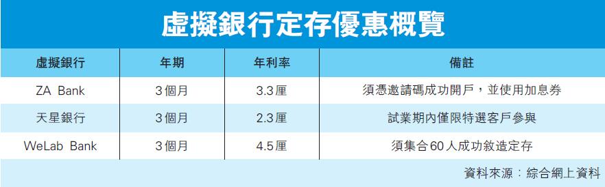 本港3間正式開業或試業的虛擬銀行不約而同在試業期都推出有吸引力的定期存款優惠,其中ZA Bank和WeLab Bank亦有推出邀請好友獎賞計劃。
