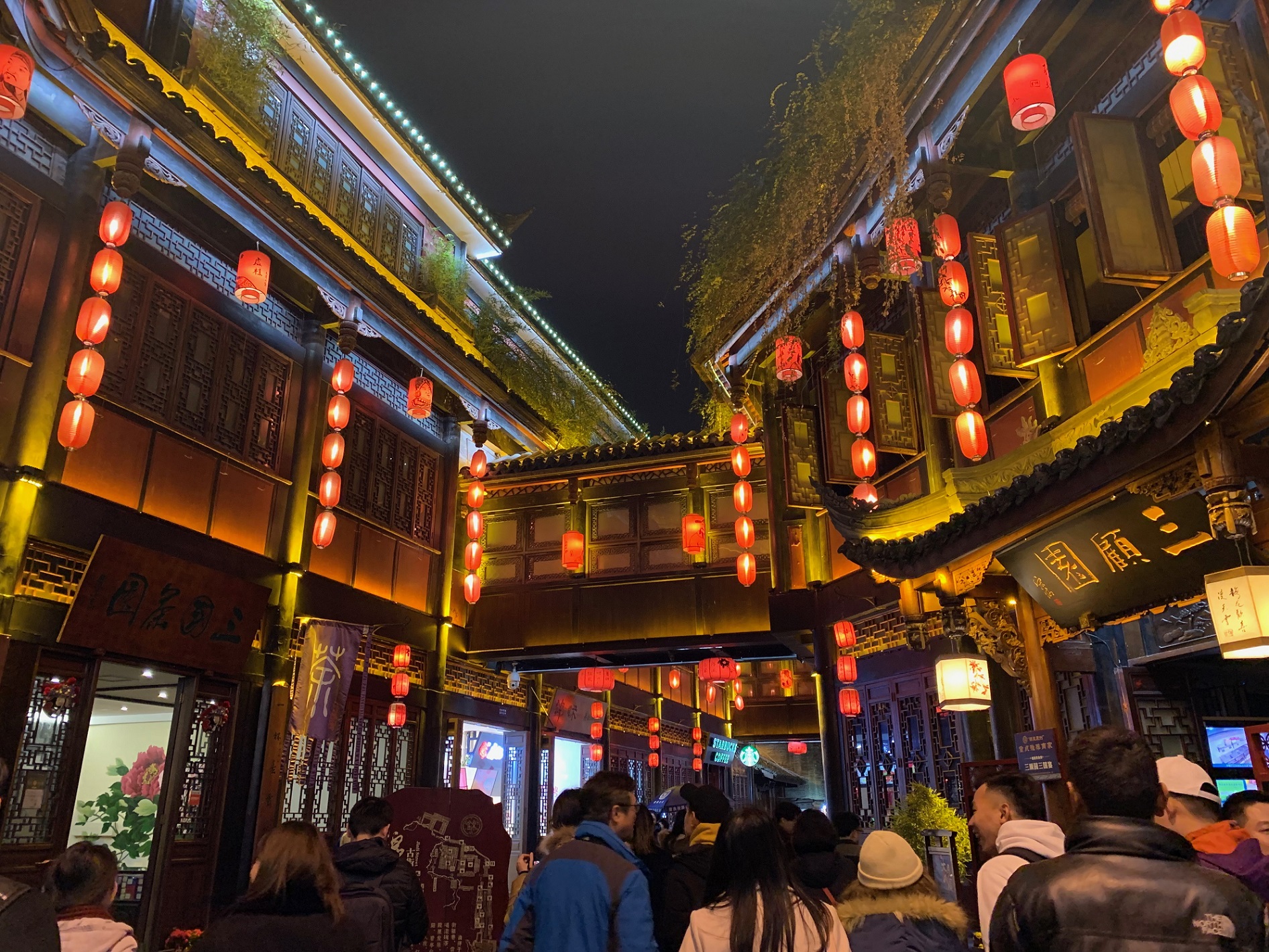 錦里還有駐場歌手坐鎮的酒吧、邊嘆茶邊看燈影戲的劇院、古色古香的星巴克、傳統小吃店、府第客棧、工藝品小店等,洋溢市井文化獨有的喧鬧和隨意。錦里中間有個人工湖,聚集不少年輕人憑欄而坐,在月色及燈籠映照下,增添古雅氣息。