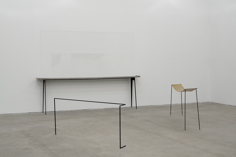 這一組看似空櫈的展品,是Thea Djordjadze的雕塑創作:(順時針從右起)《他和我的尺度》(鋼、黃銅)、《嘗試用一隻手平衡,別忘了中心》、《他和我的尺度》(鋼)。