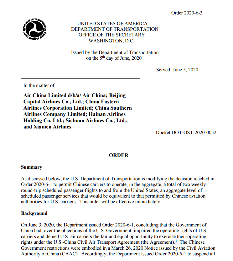 不過,據6月5日最新消息,美國運輸部宣佈,容許中國的航空公司每週營運兩班來往中美的航班。