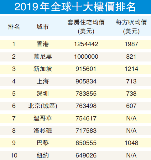 世邦魏理仕指出,即使2019年中國香港出現動蕩,外資並未有撤出香港;即使去年整體住宅交易宗數下降3%,全年樓價依然上升5%。去年香港套房住宅均價為125.44萬美元(折合約978.43萬港元),位列全球套房住宅均價首位。其實2018年香港平均樓價便已高達963萬港元,當時已連續第五年成為全球樓價最貴的城市,今年繼續成為全球首位,即已蟬聯六年第一。至於位列第二和第三的城市分別是德國慕尼黑和新加坡,均價分別為100萬美元(折合約780萬港元)和91.56萬美元(折合約714.16萬港元)。