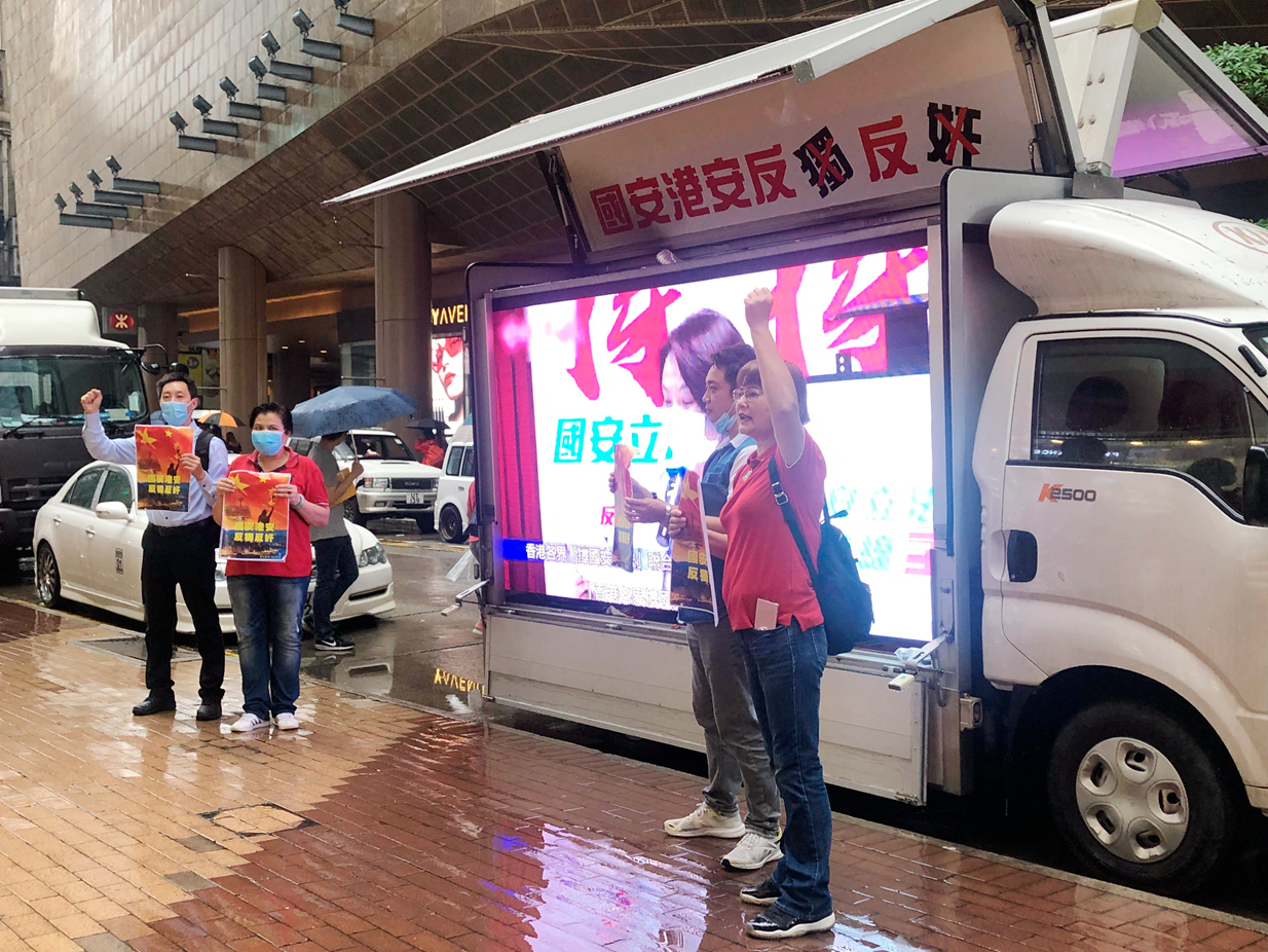 愛國愛港市民昨日冒雨於旺角朗豪坊街道宣傳國安立法,吸引不少市民駐足觀看。