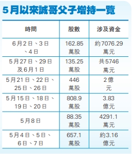 李嘉誠父子5月份月來,頻繁增持長實,涉資近11億元。最新資料顯示,本月2日、3日及4日,以平均價每股43.1942元、43.5983元及43.5660元,共購入長實162.85萬股,涉資約7076.29萬元。