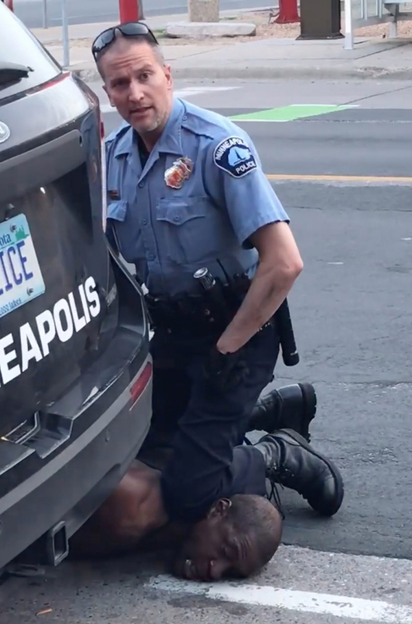 白人警員肖文用膝蓋壓住佛洛伊德頸部長達8分多鐘致其死亡。 資料圖片