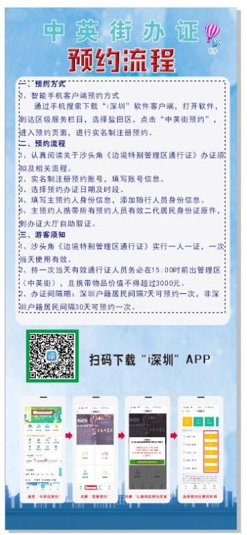 「若遊客不提前做好網上預約而盲目前往,現場辦證才預約,不但可能沒有合適的通關時間段,還可能因為當日名額不足而被拒之門外。」中英街管理局相關負責人提醒:遊客不能現場辦證,只能上i深圳預約,在辦證中心內自助取證,每日預約人數超過3000則無法預約。請務必提前一天通過「i深圳」進行分時段預約,出發前查收預約短訊,提前熟悉行程碼,以免耽誤出行計劃。通關現場準備好短訊預約碼和行程碼,並配合工作人員測溫,從而加快排隊通行時間,減少聚集和擁堵狀況發生。同時,盡量乘坐公共交通,並按照現場標識和工作人員指引,排隊等候、保持距離,共同營造便捷、安全、舒適的旅遊購物環境。