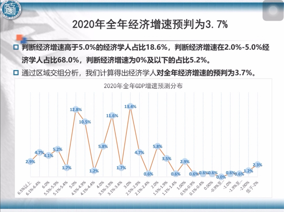经济学人预判2020年全年经济增速为3.7%。判断2020年全年经济增速在2.0%-5.0%区间的经济学人占比68.0%,在5.0%及以上的经济学人占比18.6%,在0%及以下的占比5.2%。中国东部、中部和西部地区的经济学人对2020年全年经济增速的预判均值分别为3.5%、3.7%和4.2%,全国综合预测值为3.7%。
