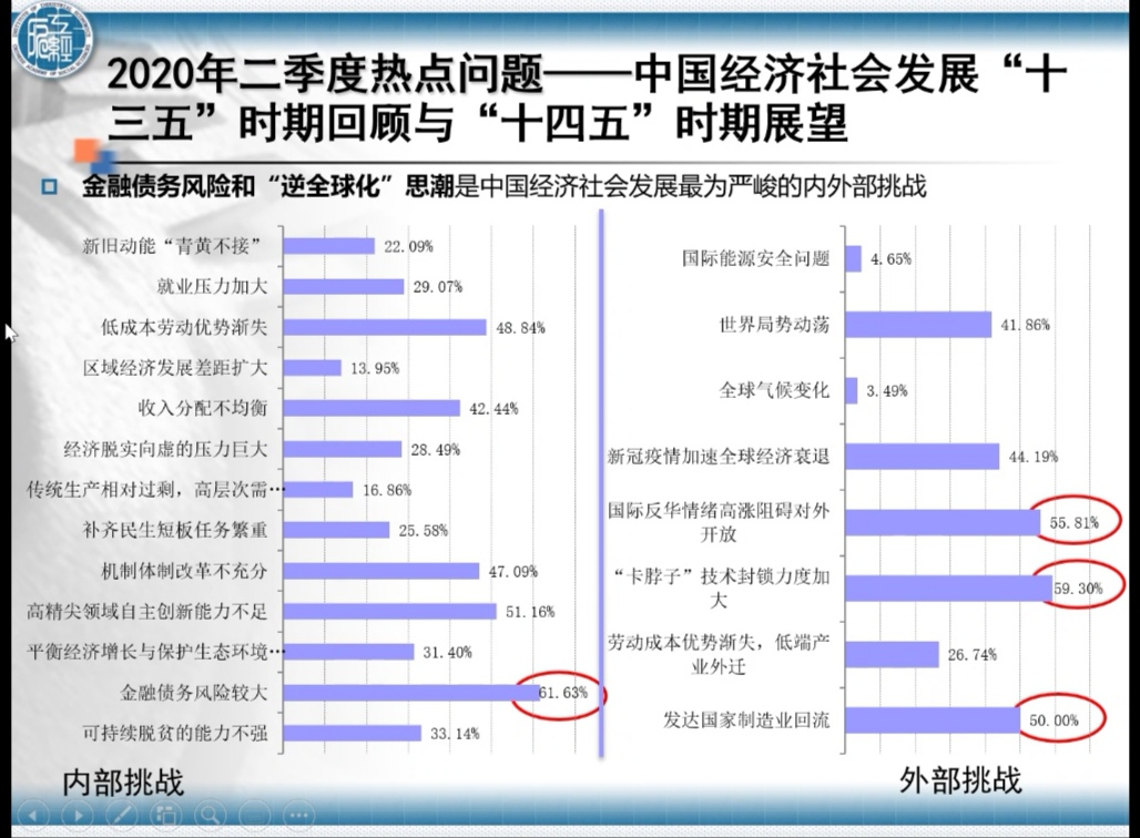就中国面临的最大机遇而言,大多数经济学人(81.40%)认为是以新工业革命为代表的技术红利,还有39.53%、37.79%的经济学人分别选择人才红利、开放红利。就最严峻的内部挑战而言,一半以上的经济学人(61.63%)认为是较大的金融债务风险,过半的经济学人(51.16%)认为是高精尖技术自主创新能力不足,而选择“低劳动成本优势渐失”的经济学人也接近一半(48.84%)。就最严峻的外部挑战而言,接近六成的经济学人认为是“卡脖子”技术封锁力度加大,还有55.81%、50.00%的经济学人分别选择了“高涨的反华情绪阻碍对外开放”、“发达国家制造业回流”。归根结底,这些挑战都是“逆全球化”思潮抬头造成的。就经济发展的韧性而言,接近70%的经济学人认为主要来自超大规模人口、国土空间、经济体量和统一市场所形成的经济超大规模性优势。还有66.86%的经济学人认为以5G、互联网+为代表的新兴产业加速发展是中国经济韧性的主要来源。