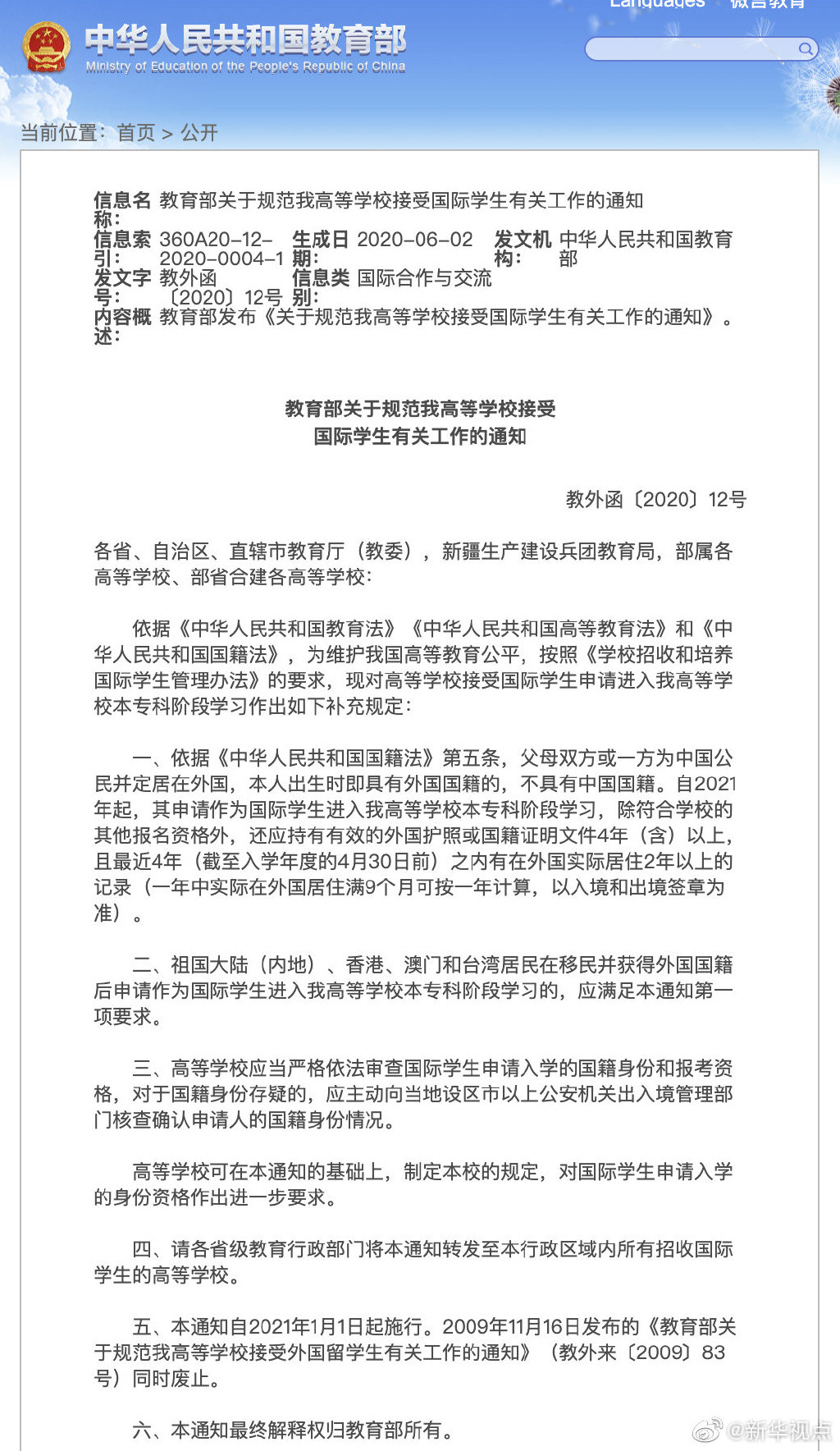 教育部国际司负责人介绍,教育部高度重视此现象,为适应来华留学新形势,解决管理过程中出现的新问题,在前期调研和广泛徵求意见基础上,对《教育部关於规範我高等学校接受外国留学生有关工作的通知》进行修订,进一步严格国际学生进入我高等学校本专科阶段学习的申请资格。