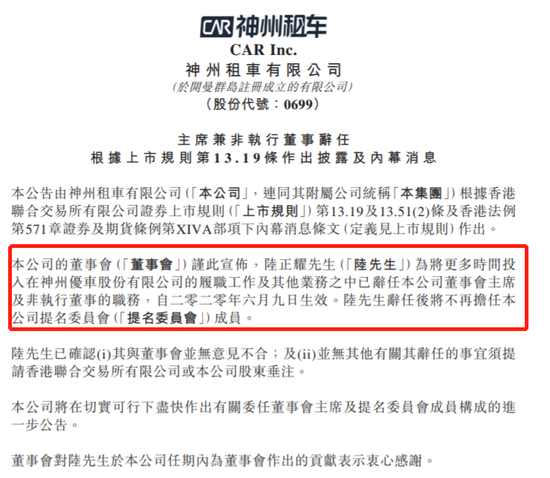 【香港商報網訊】神州租車(00699)公布,主席及非執董陸正耀辭任,以有更多時間投入在神州優車的履職工作及其他業務,於昨日(9日)起生效。