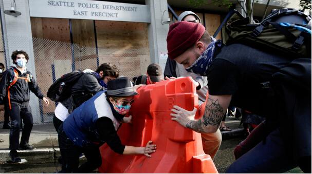6月8日,示威者在西雅图警察局停用的东分局外设路障 图源:路透社