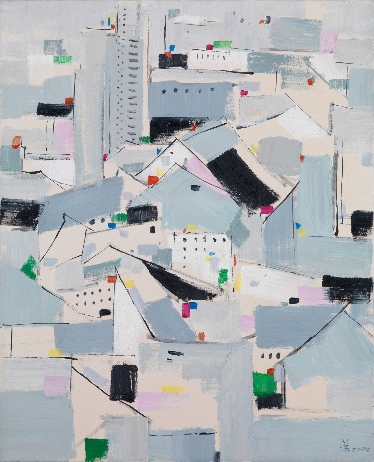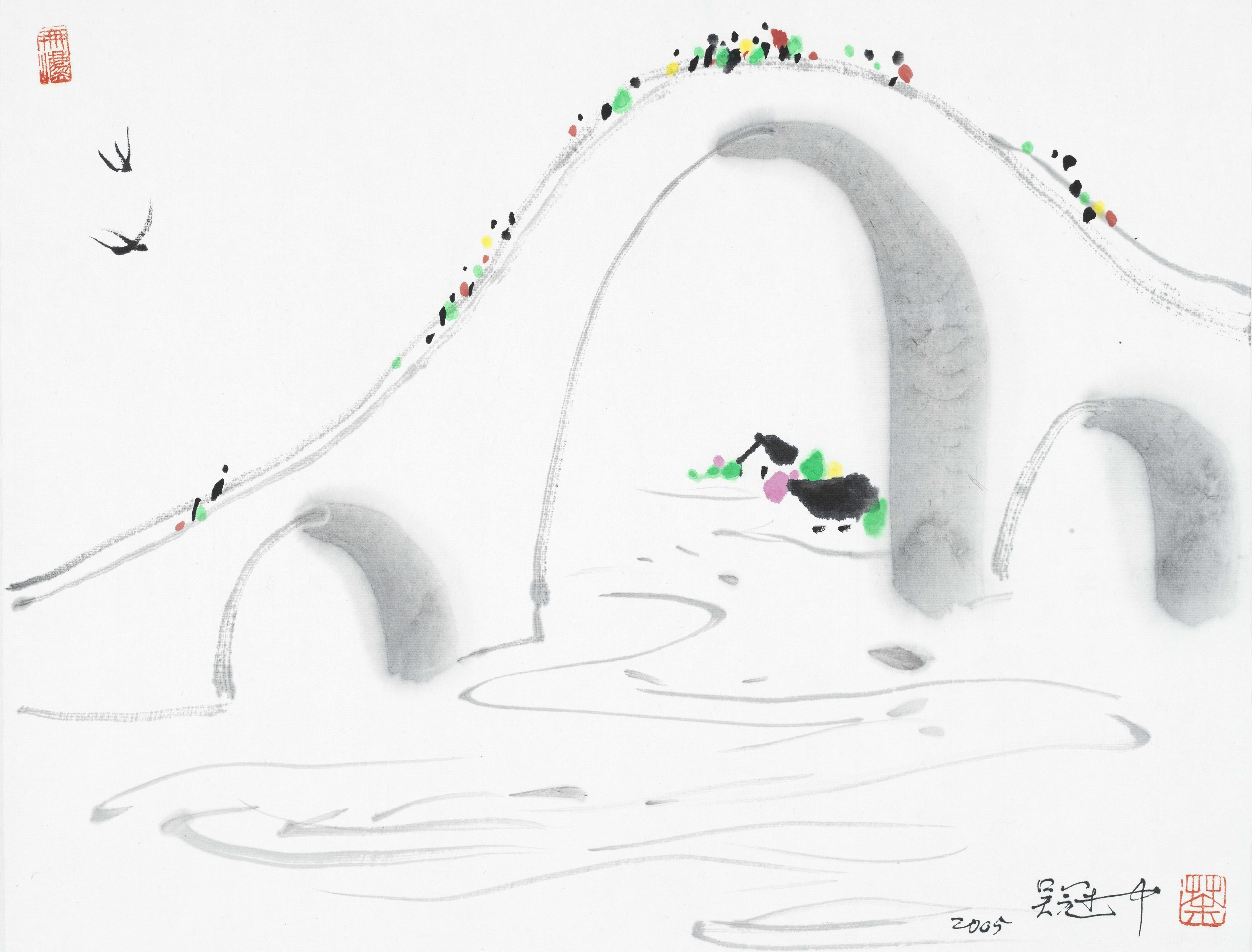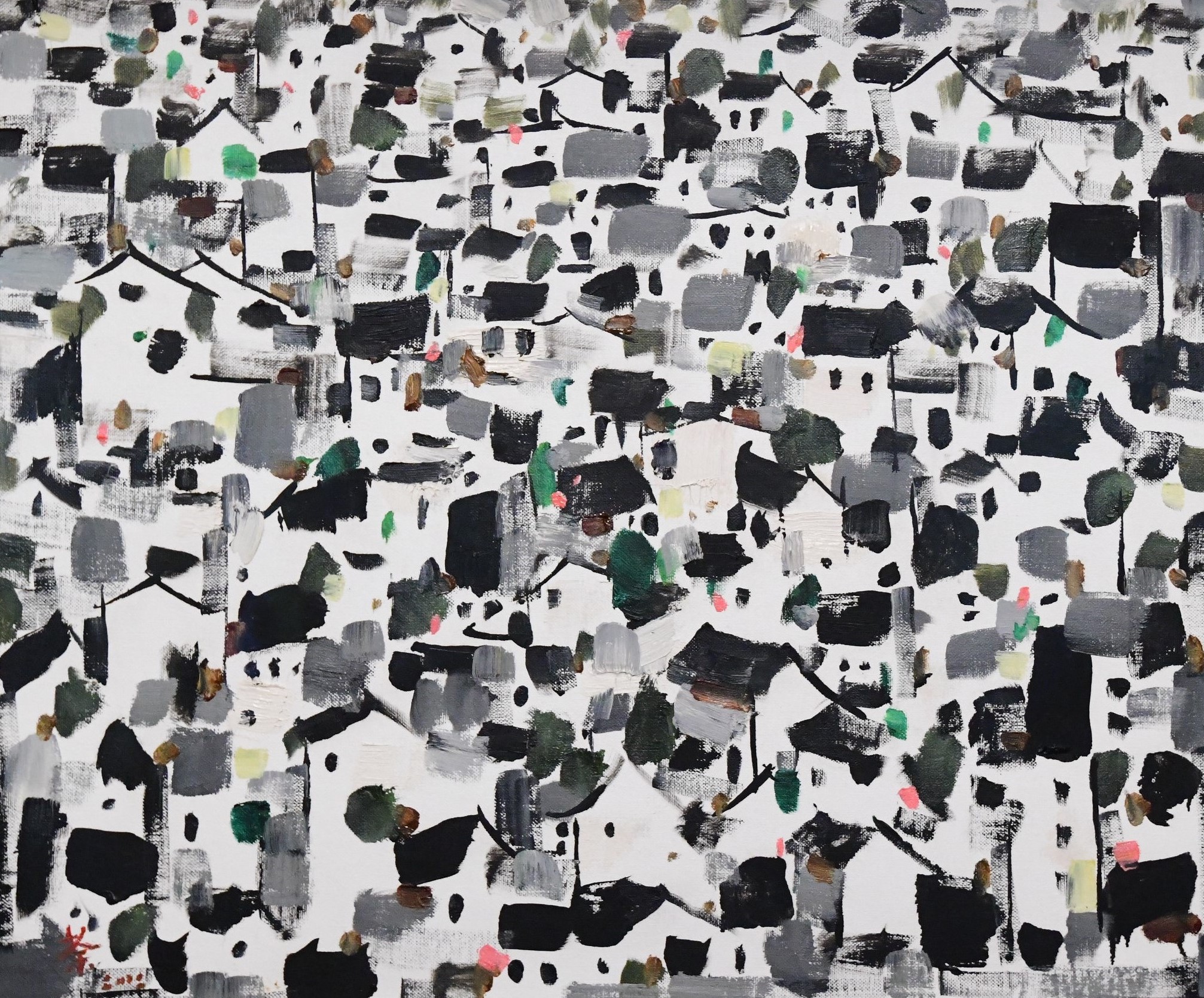 吳冠中作品《朱顏未改》,2001年。此作已精煉至更純粹的視覺元素,成為畫家追求形式美的標誌風格。