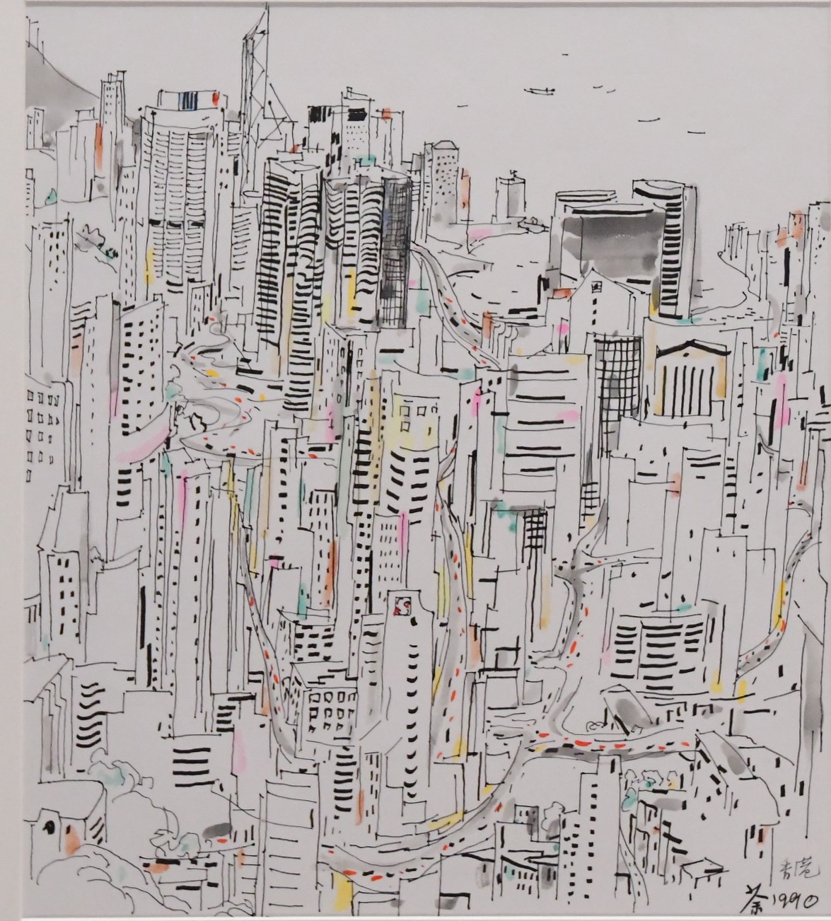 經歷這些事後,他再次踏足香港已經相隔了30年。上世紀80、90年代,他多次受邀來港舉辦展覽,「他第一次來港,覺得香港冷清,遠不及上海繁華,僅是漁港城市。到上世紀80年代再來時,印象與之前全然不同,他覺得這裏是一個開放的城市。」展品《1990年香港寫生(一)》描繪了從半山望下港島的景色,搭配不同顏色的彩點,呈現出繁華都市景象。