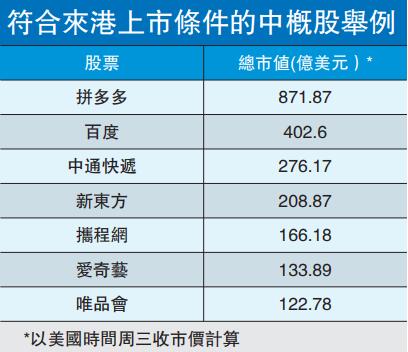 2018年港交所修订港股《主机板上市规则》,此举为寻求在港二次上市的中概股打开了绿色通道。根据港交所最新要求,美股中概股回归港股须满足市值大於400亿元,或市值大於100亿元且当期收入超过10亿元。