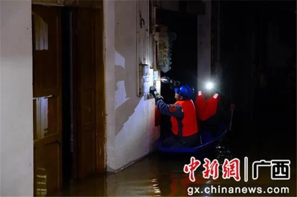 广西多条河水暴涨,柳江河水里雍镇附近河段水位一度涨到83米。 在被洪水淹没的约200米长的里雍西街,供电应急人员驾着小船,挨家挨户为商铺及民居电力设备进行紧急抢修。